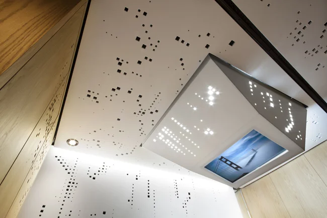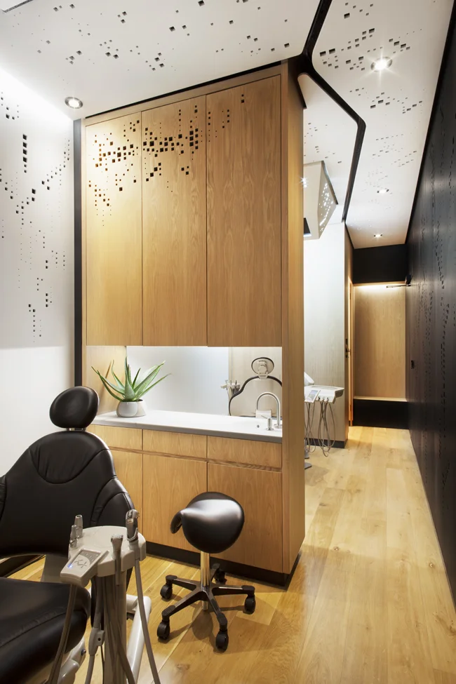 Raised wood floors and Corian ceiling panels over acoustic foam (for sound dampening) not only shield utilities, like water and HVAC, from view, but give the studio the appearance of a luxury office on solid ground. What’s more, Studio Dental’s design ensures patient comfort down to every detail:skylights let in natural light and black leather upholstered chairs offer views of video screens (affixed to the ceiling,) while perforated Richlite panels create a sleek, calming interior. The traveling facility in fact won an AIA 2016 Small Projects Award for “deftly balanc[ing] the challenging program with a sense of dignity."