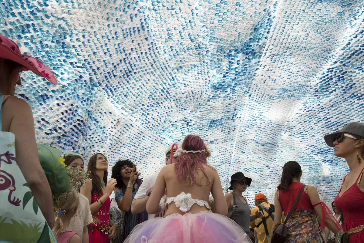 New York City, the largest city in the United States, is responsible for massive amounts of trash production. In just one hour, 53,780 used plastic bottles are thrown away in NYC alone. To demonstrate this shocking number, artist Jason Klimoski, created a giant cloud installation created from 53,780 plastic milk jugs and water bottles. The artist collected these plastic vessels and wove them together to create “Head in the Clouds.” It is a “pavilion people can walk into, sit inside, and contemplate just how much plastic is thrown away every day.” This cloud isn’t only beautiful and intriguing, but it also sends a powerful message about plastic consumption.