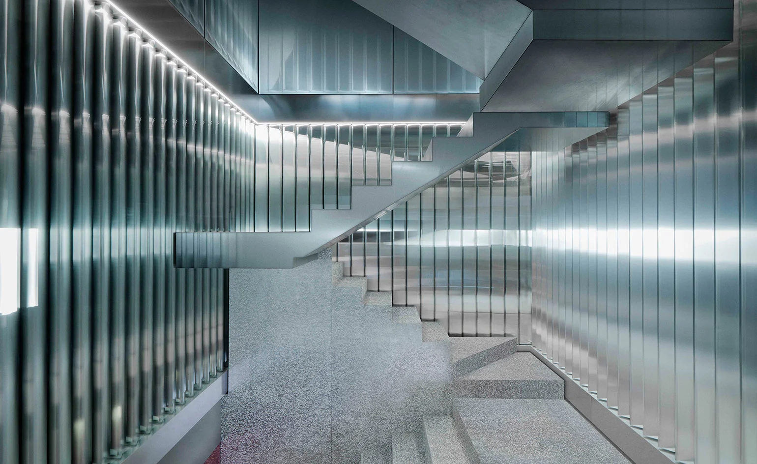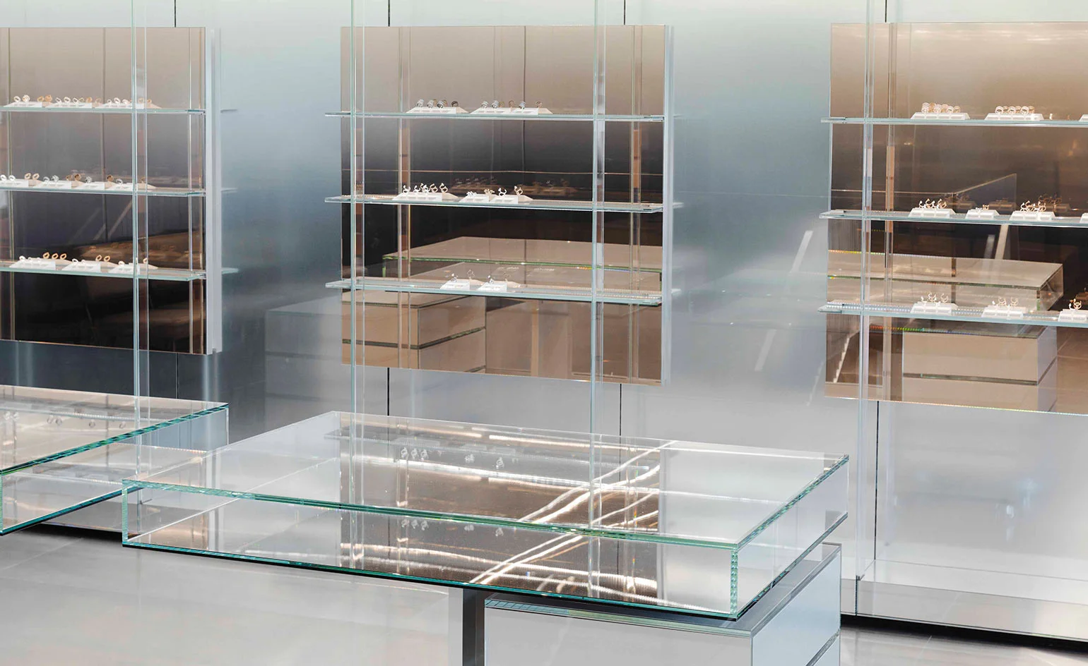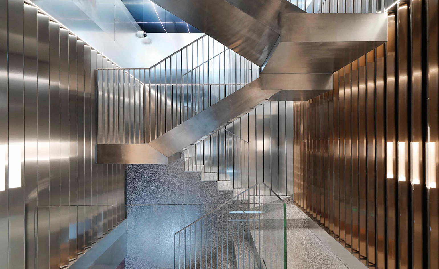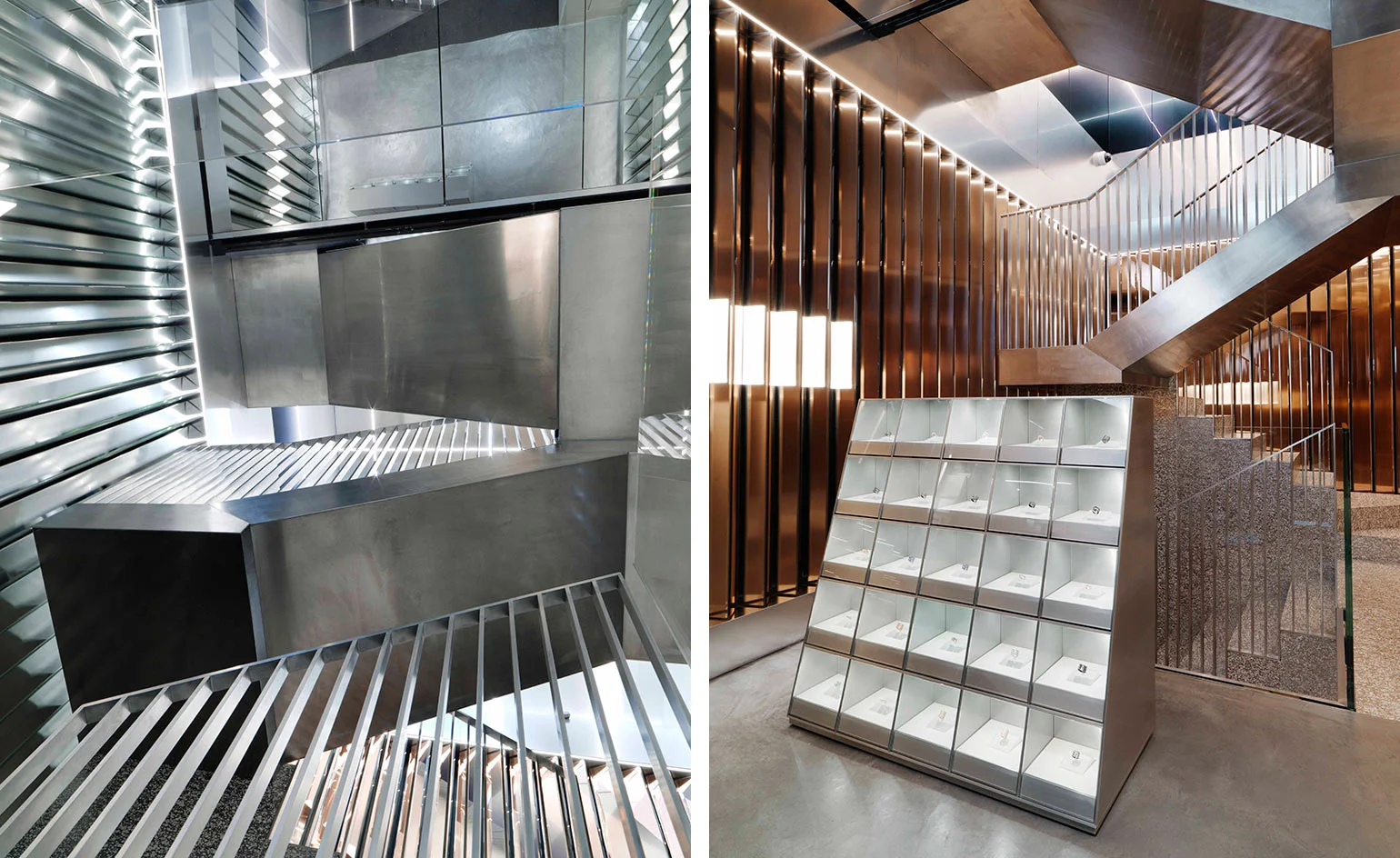Upon entering Repossi’s steely Parisian jewellery box, what is immediately clear is that this is a retail store like no other. Donald Judd furniture is placed in-situ. Linear display cases are cut from reflective slats that rotate like high-tech vertical blinds, while the salt and pepper terrazzo floors are a mix of foaming aluminium and resin. The industrial metal also covers the store’s walls, while overhead lighting takes the form of grid-like LEDs that feel slightly biblical in their intersections, à la Tadao Ando’s Church of Light. Spread over three floors, the tactile boutique is a retail revelation.