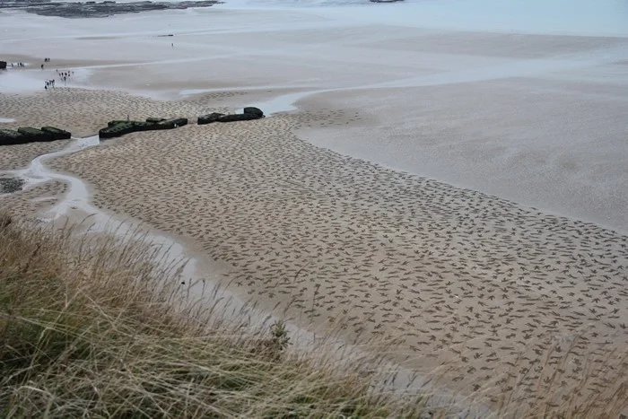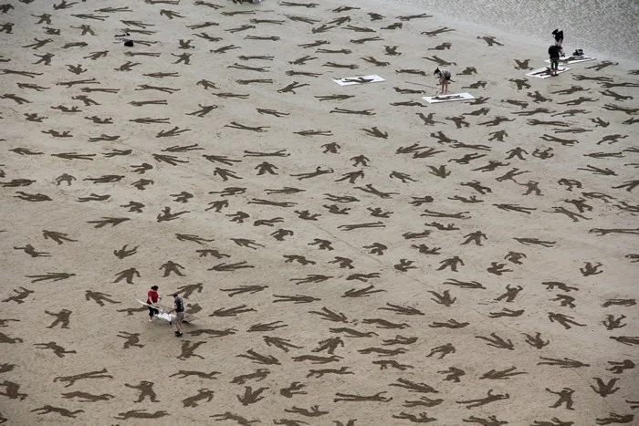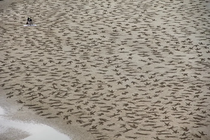 D-Day is one of the most notorious days when discussing World War II. At the beaches of Normandy thousands of soldiers died on June 6th, 1944. This day will forever be remembered as a day to honor those who fought and died. As a reminder to the public of what happened at at Arromanches, artists Jamie Wardley and Andy Moss, along with 550+ volunteers “took to the beaches of Normandy with rakes and stencils in hand to etch 9,000 silhouettes representing fallen people into the sand.” The piece was very impactful although it only lasted a few hours before being washed away by the ocean's tides.