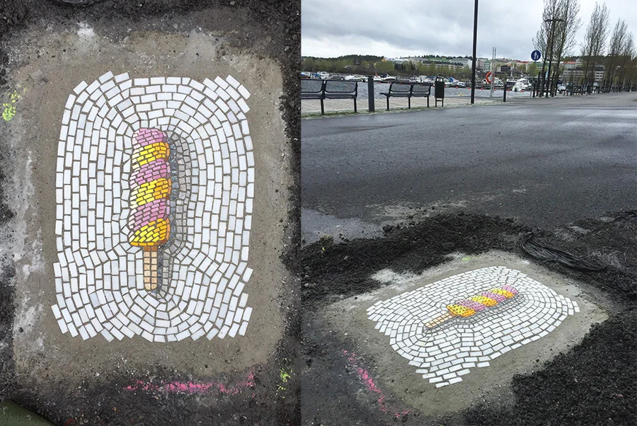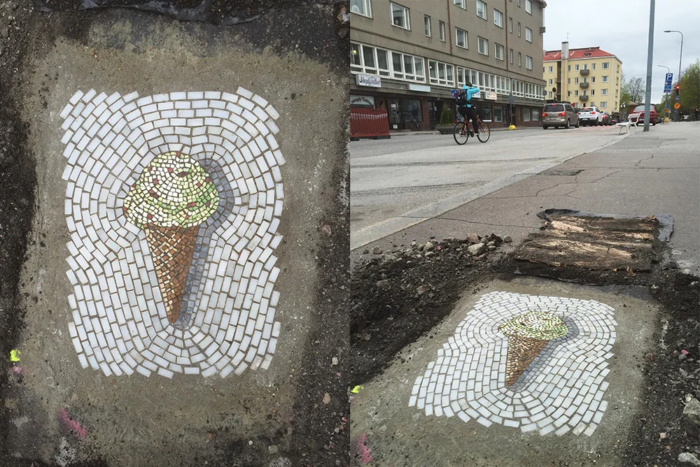 Potholes cover cities creating eyesores that no one wants to look at. However, artist Jim Bachor knows that everyone loves ice cream, and would have no problem looking at sweet treats all day long! Bachor has a goal to fix potholes, while bringing life and color to cities at the same time. He has covered potholes with a variety of mosaic artworks including flowers and beautiful patterns, but his ice cream mosaics have definitely been the sweetest! He calls his series of 10 ice cream mosaics “Treats in the Streets.” His work can be seen in cities all over the world from Chicago to Jyväskylä, Finland. Keep on the lookout for some sweet art in unexpected places during your travels! Sometimes beauty is in the most unexpected places.